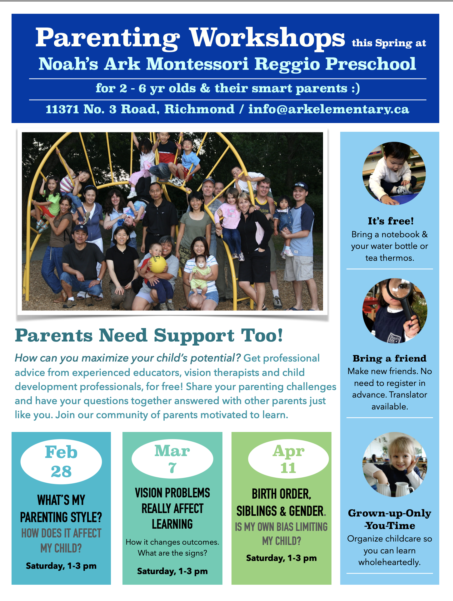 Ark Elementary School, together with our Noah’s Ark Preschool, is an independent, non-denominational, Early Years Specialist school, focused on meeting the unique social, emotional and academic foundational needs of learners from 2 1/2 to 12 years of age. We embrace the best of what is understood in Montessori, Reggio Emillia and traditional educational pedagogies and practices, to create an authentic, whole-child, family-centric approach to learning and development, while exceeding BC Ministry of Education curriculum outcomes. We are unique home to happy, motived learners and a caring community of their families.